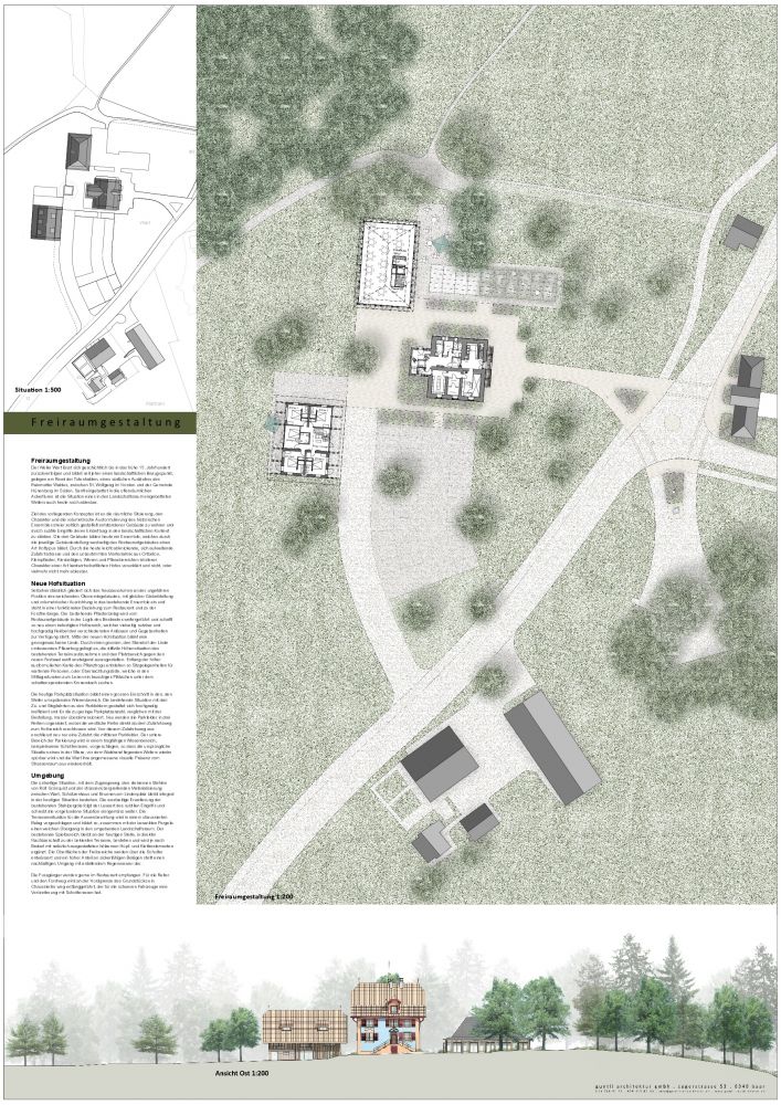 Unser Konzept der Freiraumgestaltung verfolgt das Ziel, die räumlichen Situierung, den Charakter und die volumetrische Ausformulierung des historischen Ensembles zu wahren und durch subtile Eingriffe deren Einbettung in den landschaftlichen Kontext zu stärken.