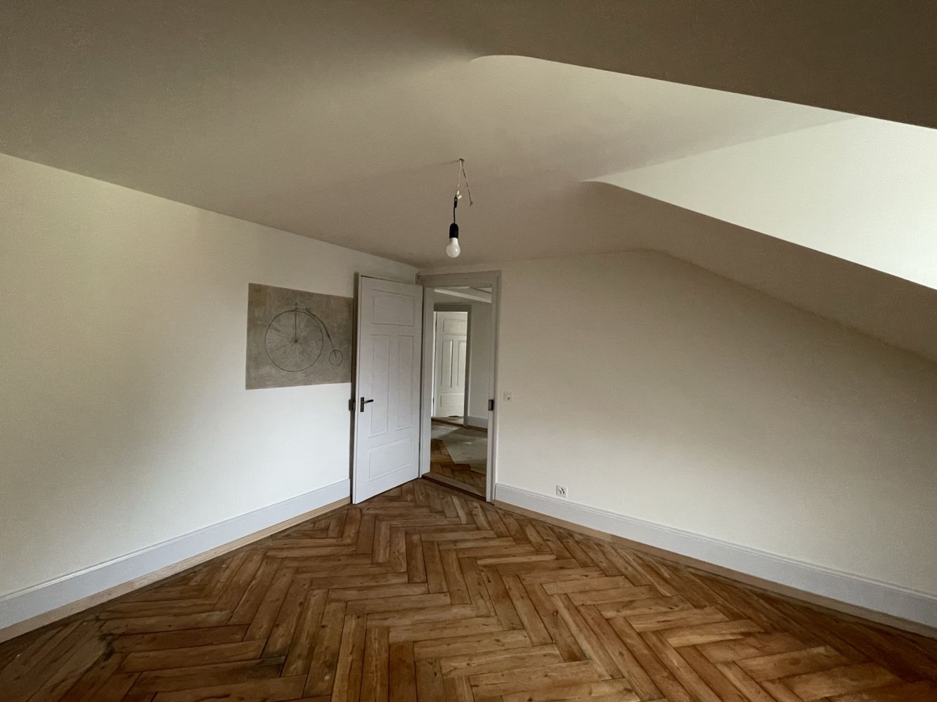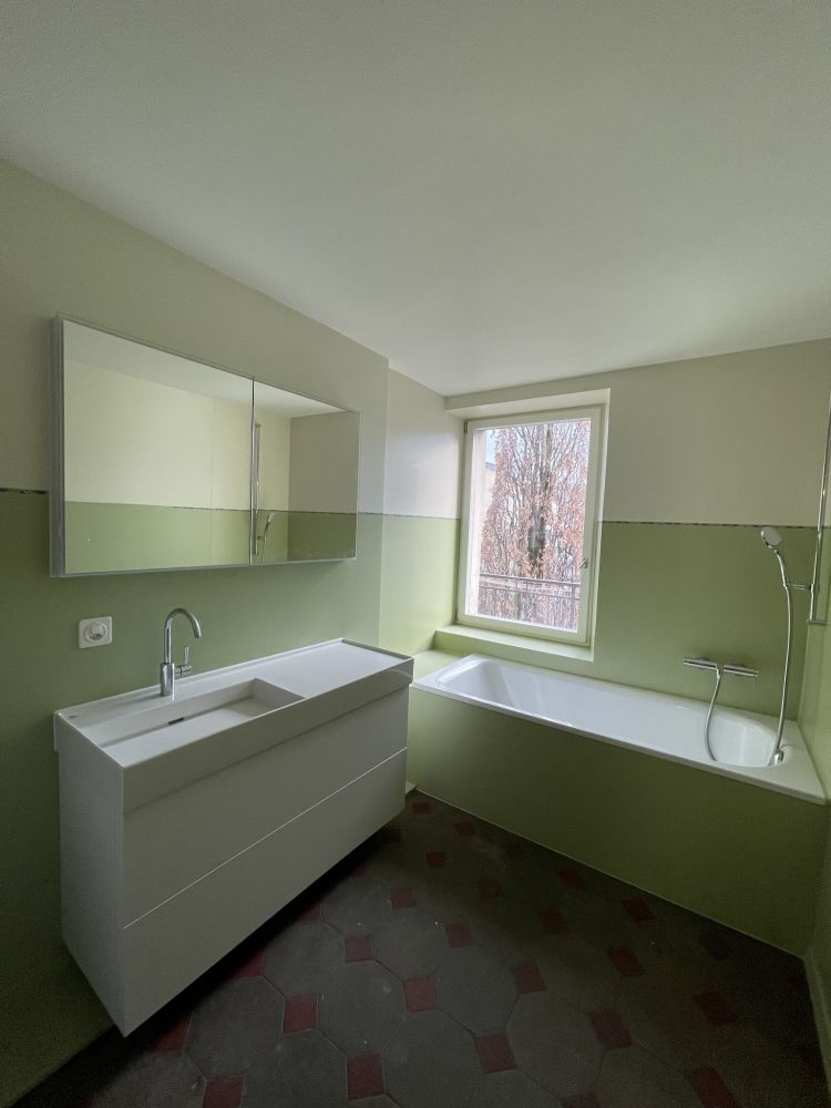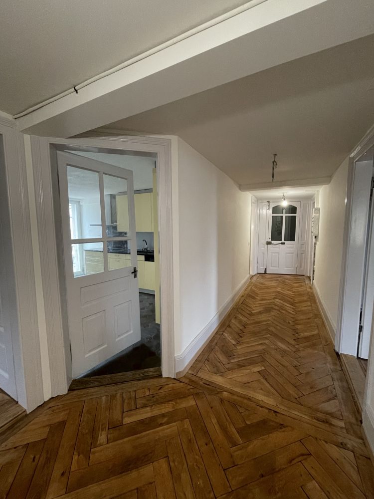 Die Wohnung wurde um 1970 grundlegend erneuert und umgebaut. Der rauhe Kellenwurf an Wänden und Decken, sowie die zeittypische Badgestaltung mit den orangen reich verzierten Plättli vermochten in diesem von Leichtigkeit geprägten Gründerzeithaus nicht zu bestehen.