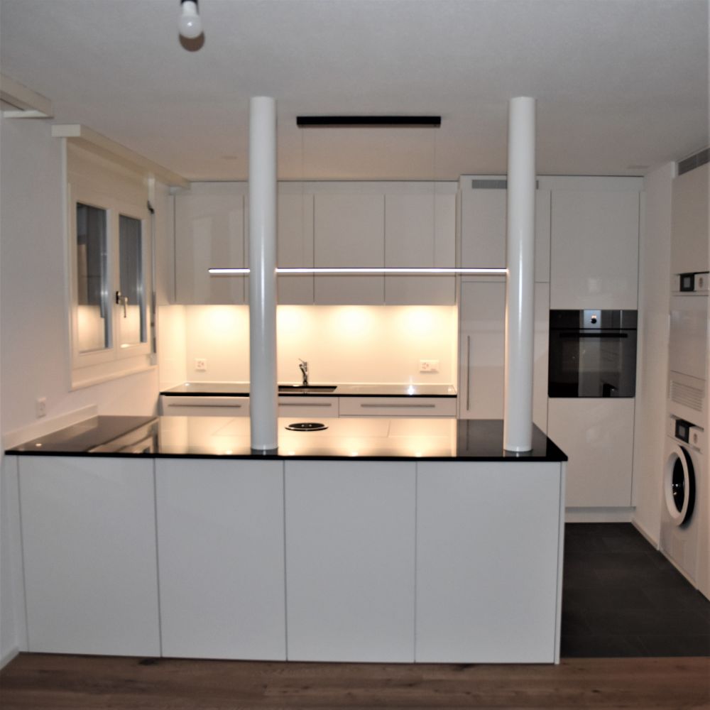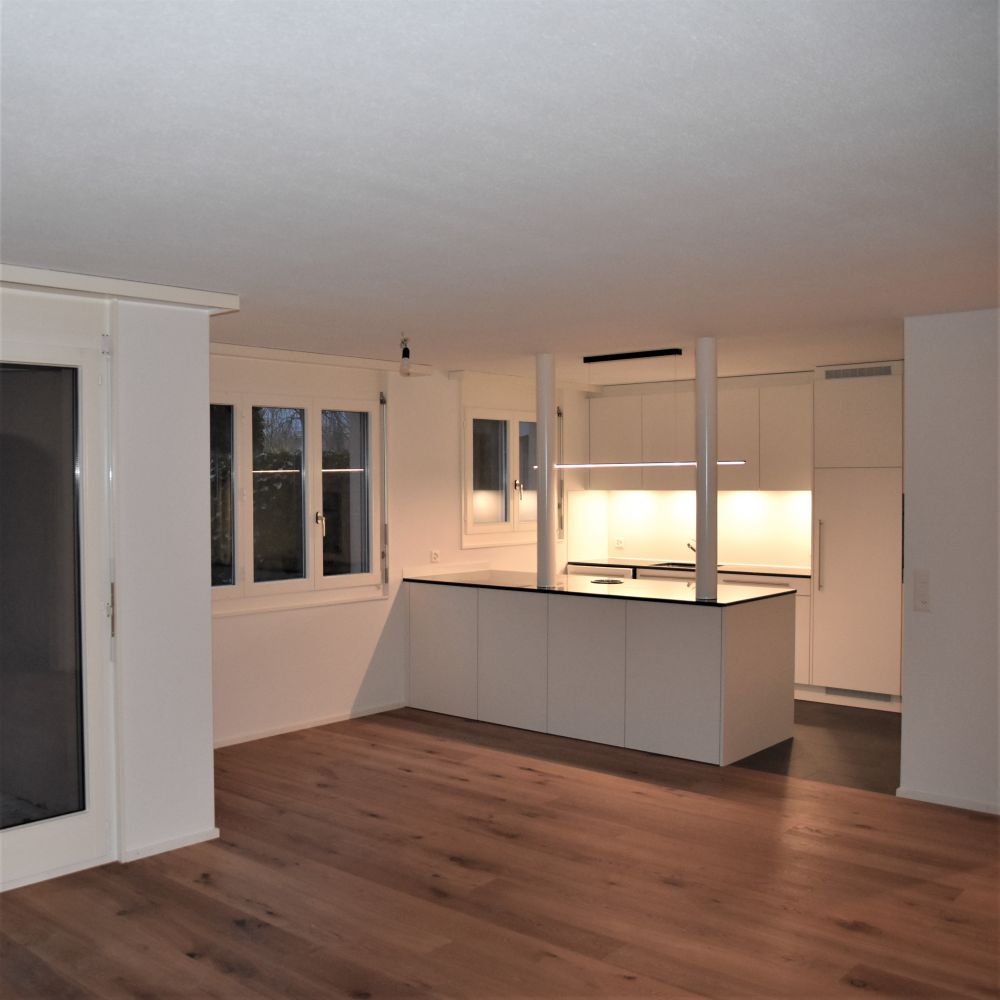 Die 3-Zimmerwohnung wurde einer Teilsanierung unterzogen. Durch den Abbruch der Trennwand zwischen Küche und Wohn-Essraum ist nun eine grosszügige, offene Wohnsituation entstanden. Zwei Stützen übernehmen die statischen Aufgaben. Die bestehende Einbauküche ist komplett erneuert worden und verbindet mit der neuen Kochinsel nun die Küche mit dem Essbereich. Die bestehenden Bodenbeläge wurden durch dunkle Keramikplatten und einem Eichenriemen ersetzt. Ausserdem sind alle Oberflächen inkl. den Fensterrahmen und Flügeln gestrichen worden.