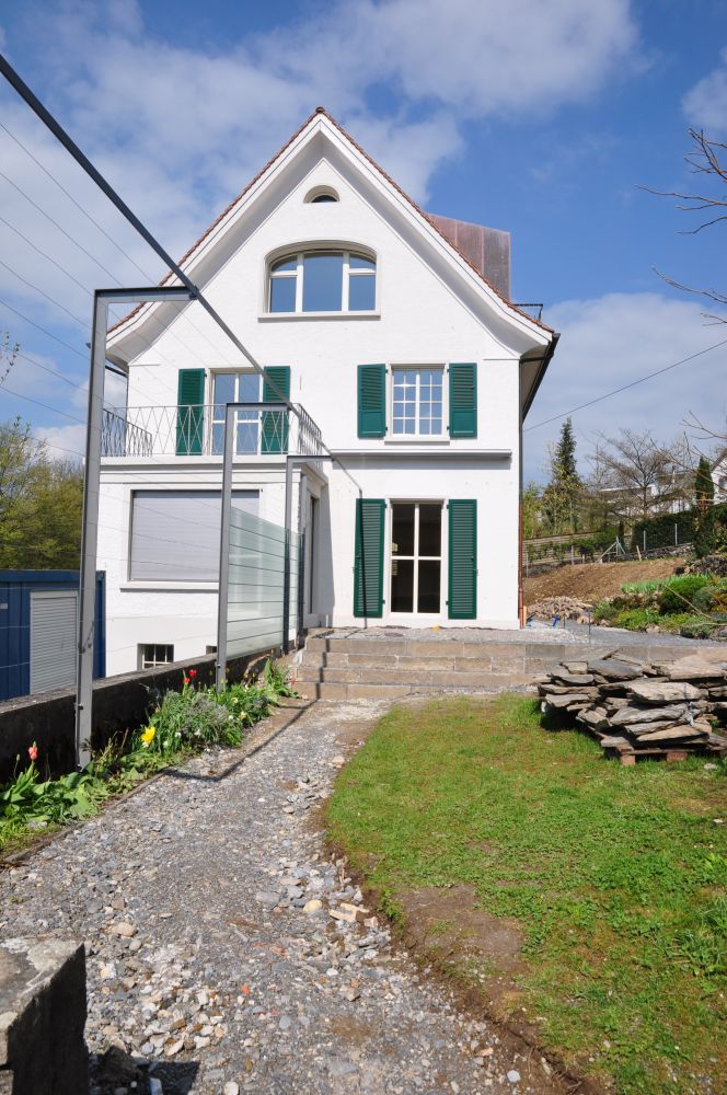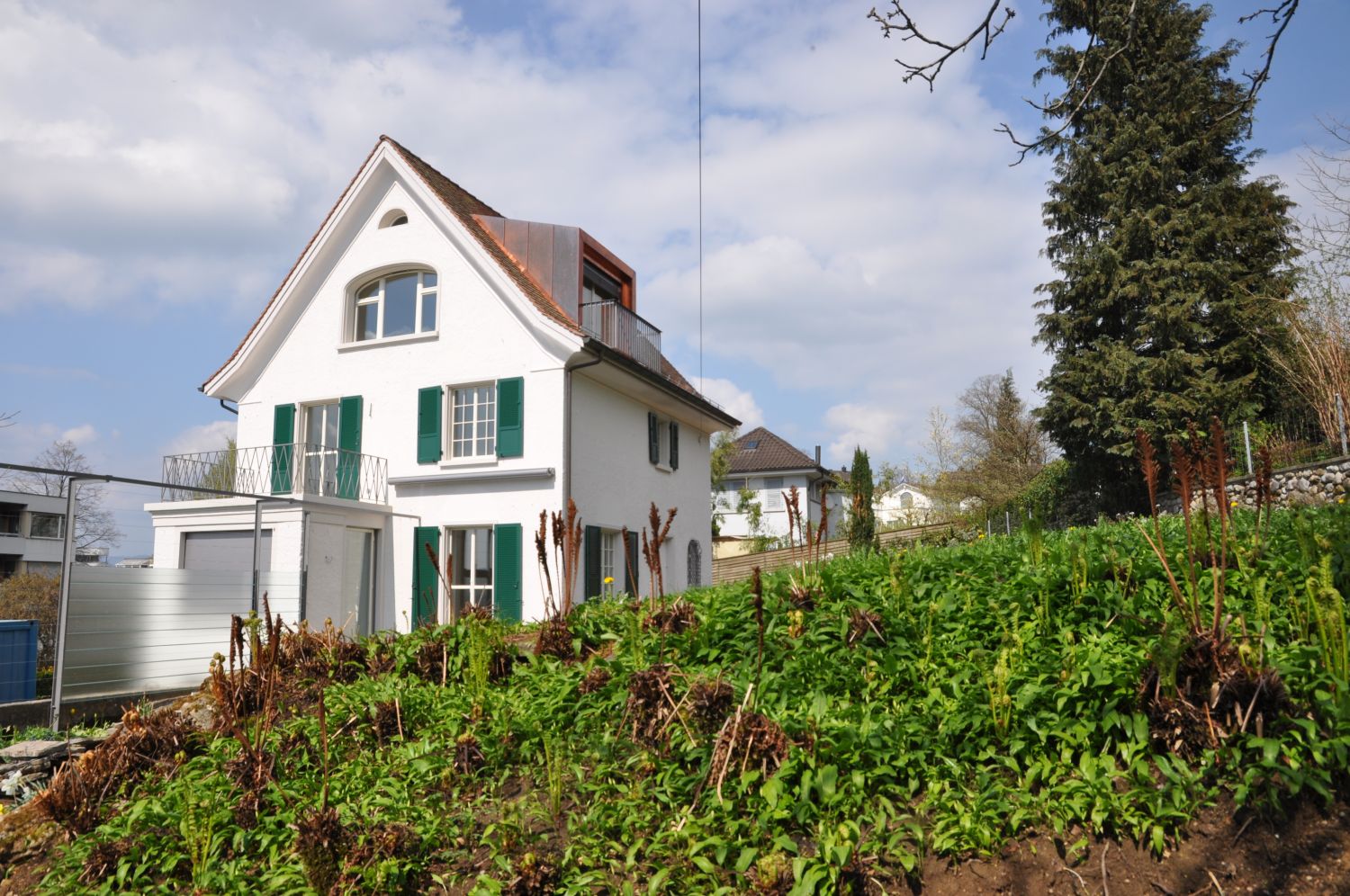 Bei diesem Umbau konnten wir das 1921 erbaute und mehrfach umgebaute Haus den neuen Bedürfnissen anpassen. Mit dieser Gesamtsanierung konnten wir das Haus als Musterbeispiel den aktuellen Anforderungen bezüglich Energieverbrauch anpassen. Die neue Erschliessung im Haus, die neue Dachlukarne und das grosse Panoramafenster im Dachgeschoss fügen sich selbstverständlich in die Baustruktur ein. Die Grosszügigen Nasszellen und die komplett neue technische Erschliessung gewährleisten den Weiterbestand dieser Liegenschaft für die nächste Generation. Das Projekt war eine Zusammenarbeit mit Ruedi Zai. Die Umgebungsgestaltung wurde durch Benedikt Stähli erarbeitet. Trotz heftigem Wiederstand der Behörden konnten wir die bestehende Einfahrtsituation mit den Mauern entlang der Ägeristrasse weitgehend belassen. Somit steht das Haus im Privatgarten und ist nicht direkt zur Strasse offen.