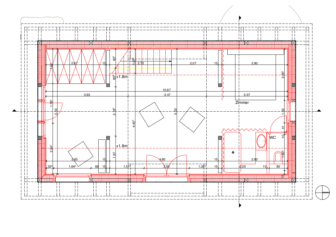 Offensichtliche Schwachstellen beim bestehenden Gebäude sind die Fundation vor allem auf der Nordseite. Das Dach wurde nach einem Schaden verstärkt und Fachgerecht instand gestellt.